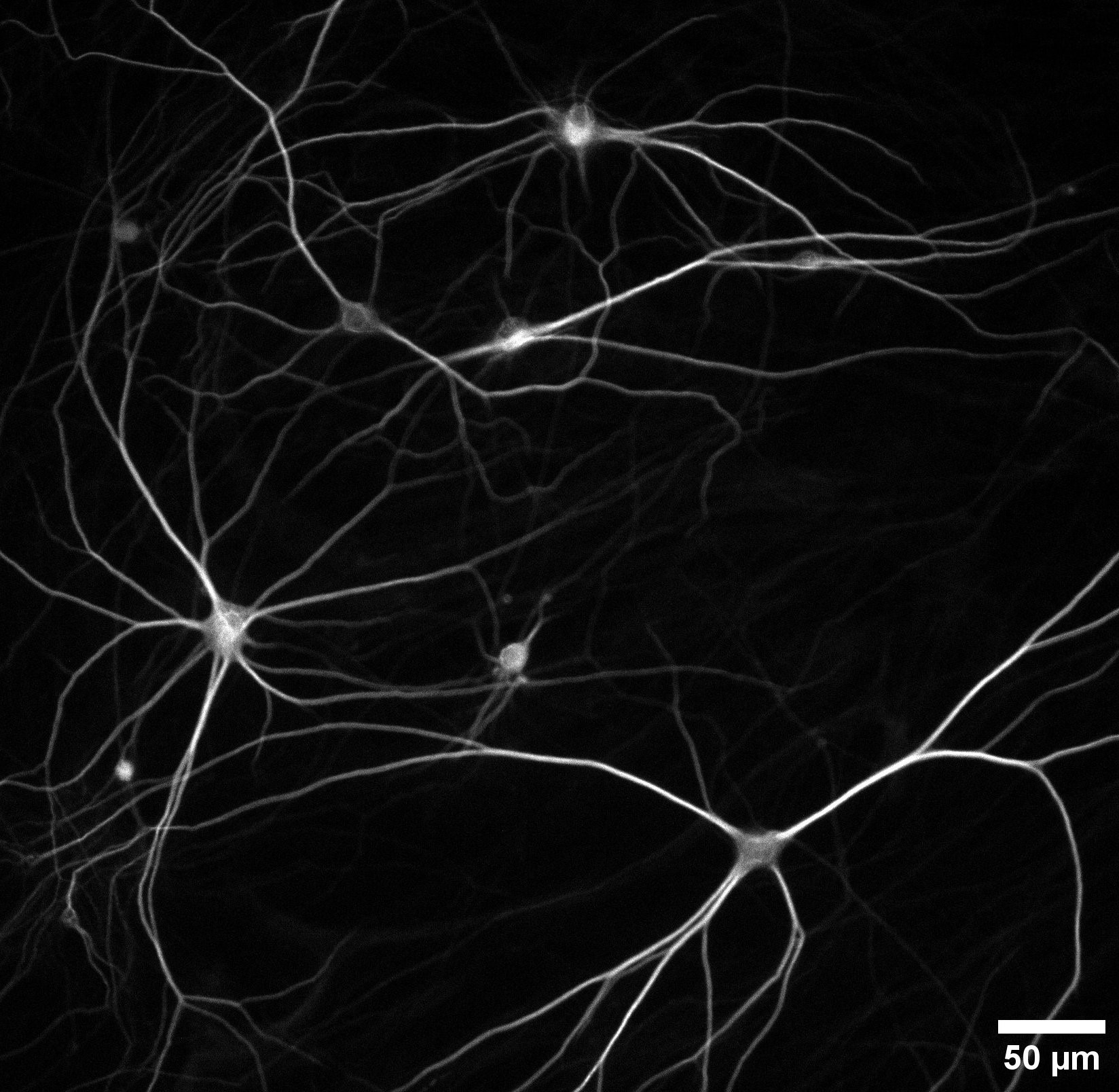In this case, the cells have been genetically programmed to become glutamatergic neurons, an important type of brain cell that transmits signals. The image mainly shows the dendrites, branched extensions that connect neurons to each other. They form a kind of network of wires through which information can flow.